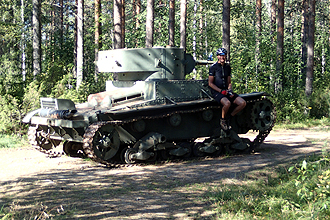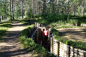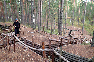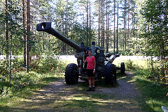 We took a while to fall asleep last night due to manic husky dog barking on a farm nearby. It sounded like 10 dogs and they were crazy. Eventually they stopped and we had silence. Maybe they were being pestered by wolves? We had a later start as we had a shorter day today. Shortly after we got on the road we came upon hunters. Must be the start of the season. They were sort of spaced at intervals along the road all looking into the bush, fully kitted out with camo gear and rifles. They were pretty serious, waiting for the go ahead perhaps? We kept up a high speed. We arrived in Kuhmo at about 11:00 am and did some grocery shopping. We bought some cooked chicken for lunch and went to the nearby swimming hole on the lake to eat it. It was a beautiful day and the swimming hole area was lovely. Green lawns and the beautiful lake. We left Kuhmo on the bike path and then turned onto route 75 to Lieksa and Nurmes. A few kilometres on we came to another War Memorial for the Winter War. It was very interesting as there were restored trenches and the original bridge defences were in place. There were also tanks and various other military bits and pieces to look at. Explanatory boards were placed here and there to provide more information. We turned off onto a gravel road which we rode for 10 km towards Luotso National Park and our campsite. We had found a campfire pit on the GPS in the State Forest and thought it would be a good campsite. It was amazing! A little shed with chopped firewood, a campfire with grid and metal skewers (for toasting our marshmallows!), lovely level ground under the pine trees, and a toilet. It was so quiet and sat on a strip of land between two lakes. It was perfect! We had bought chops to braai/barbeque in expectation and had a great fire and a relaxing afternoon.