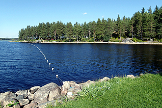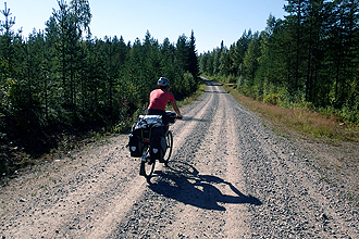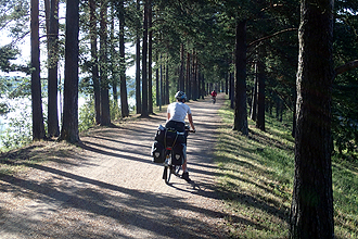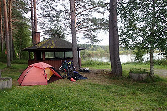 The ride today was really enjoyable and we were suprised to be on dedicated cyclepaths throughout, even after passing through Lappeenranta. This is fabulous and makes for relaxed riding. We were in two minds about whether to stop at our laavu or go on about 25 km to the next campsite, but we have only two nights of camping left in Finland and we love using the laavus. There was about 2 km along a gravel road to get to it and it was on a lake with a lean-to, campfire and even changing rooms! Wasn't quite as spick and span as we have become used to, one always finds some litter when close to towns. We got a fire going with some difficulty as there were only very big logs of wood (1 m long) and no axe to chop them up with. Then... yes you guessed it... down the road came two guys on motorbikes! We smiled and they came over to the campfire with... yes you guessed right again... A PACK OF SAUSAGES! They asked if they could warm them up and of course we said yes. We chatted with them for a while, they were nice guys as Finnish people always seem to be. I asked about these lids covering up holes cut out of the jetty at the lake. I assumed they were for ice fishing as they looked convenient! They said that they were for washing carpets!! I was quite suprised. Who washes carpets? And anyway, what were the chances of the carpets comnig out of the lake cleaner than when they went in? He added that now it is illegal to wash carpets in these things but people still do it. So there you go. I also asked about the paper mills as this area seems to have many mills and goods trains as well as trucks carrying logs. He said that there are 3 large mills here in this area and a fourth in Russia in Svengorsk (this is just over the Russian border). The one in Svengorsk is aparently managed by an American who lives in Imatra and travels into Svengorsk each day.
