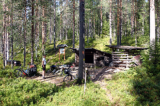 We had about 14 km to ride after Sodankylä to a picnic site on the GPS. We turned off a little early and found ourselves faced with a steep, chunky gravel road. We left the bikes at the top and walked down the hill, and then up through a beautiful pine forest to the lake shore. There we found a brilliant Laavu, with freshly chopped firewood for burning and seating all around. Also a toilet and further firewood store. On top of this there were wooden steps down to the lake for swimming. Perfect! We then spotted that there was a road further on from where we left the bikes, for more direct access. We walked back to the bikes and rode a little further on and then set up camp at the shelter. We even made a fire; the first time on the trip. The smoke sure does get rid of the mozzies! We had another cold swim and ate a supper of veggies which we are both craving now. The skies cleared towards evening so we are hoping that after 5 days in Finland we will have warmer weather. We have only one more day riding north of the Arctic Circle, having crossed it going northwards on 17 July. So we have spent a month of the three in the Arctic which is quite amazing. We are starting to notice the undergrowth really coming alive; berries and mushrooms sprout everywhere. You can just pick blueberries as you go along, they grow everywhere. It's a world in minature under your feet; the tiniest flowers and lichens and mosses. Beautiful.