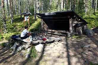 The GPS map showed us to turn right off our gravel road to the laavu. All we could see was a house and letter box and it looked like a driveway, but we went for it. At the end, the track continued to another house and we could see the shallow lake behind it. No laavu. We left the bikes and back tracked to a hiking path which we followed and sure enough, there the laavu was on the lake shore. A proper platform for sleeping on under cover (we don't use this as we pitch our tent, but it's a great idea if you have a mozzie net), a good fire area with seating, toilet up the hill and as much wood as you would need. Mike set to work chopping it into smaller pieces and we got a fire going. We each had a "bucket shower". This entailed standing next to the lake and filling a slightly holey metal bucket we found at the shelter with water and throwing the water over ourselves. Quite effective. We were dressed and getting ready to cook, when down the hill came a walker carrying a sausage! He was probably in his later 50's and as he approached said "No England" to which we answered "No Finnish!". He then took a seat at the fire, stuck his sausage on a stick and put it in the flames to warm it. Quite happy, he told us all about his hike, hand signals mainly. We could not understand a thing but tried to sound encouraging. He then took out his phone and we understood he was trying to phone someone who could speak English to translate. We told him we were from Australia and he said things like "hop hop hop" and "Sydney?". Anyway, at least he made the effort! When he got through to the person on the phone it seemed they did not want to translate, so he shook our hands and went off on his way. This is the second rule of bush camping: someone will ALWAYS come along. The sausage angle was a new one though.