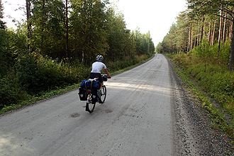 We were on a minor road today which was good quality and despite its size, it was actually quite an important through route for traffic. Being a Sunday it was quiet. We stopped at a church around 30 km for a coffee break but then hopped back on the bikes as there were HUGE mozzies there. Nothing like really feeling like a coffee and then you end up as breakfast. As an aside, very unusual, finding a church to rest at! We don't see many churches in this part of Finland. Anyway, we managed the break about 10 km further on where we just sat on the bitumen at a bus stop with no shelter. The weather was good, the road was good, but we were... bored? Apathetic? Just wanting the day to be over? We don't know why we feel this way. It could be the length of the trip, or the remoteness of our days here in Finland, or just needing a break. We don't know. Normally when you ride along and don't have much to occupy your mind eg. jaw dropping views (Norway), crazy 14% climbs (the UK) or the myriad of cycle routes (the Netherlands), you tend to think of things in your life or sing songs. I've now exhausted these options; my life is now riding a bike (albeit only for a few more weeks) and I am bored of my songs not having listened to anything new for 5 months. So lately, well, there is just nothing going on in my head. Perhaps this is what people strive for when they undertake these sorts of trips? Anyhow, one thing is clear, we have Estonia and Latvia still to go and need to start with a fresh burst of enthusiasm. Maybe tomorrow?