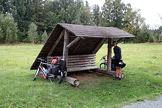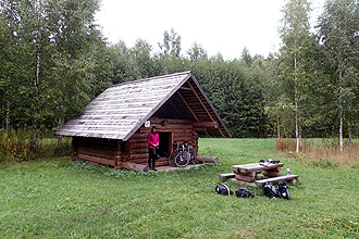 The weather was perfect today and the sun rose over Lake Peipsi to greet us. It is cold and difficult to get up early, so we will lie in a bit these last few days. We had our breakfast stop in Tartu, which is a large university town and seemed very different. People greeted us and looked interested in our bikes as we sat in a park eating breakfast. They did not seem as closed off as in the small villages we have been through. We even passed a group of road bikers out on their Saturday morning ride, which we have not seen... since Ireland perhaps; they all greeted us. We had another day of flat, peaceful riding. Only the Netherlands beats Estonia when it comes to flatness! I am still recovering from my cold and felt a bit grim, but we arrived at our campsite at 2:00 pm which was 4 hours riding time and that was long enough. We are still amazed by the effort that is made by Estonia to create outdoor recreation spots at every opportunity. As an example, shortly before our campsite we passed a lake with a fabulous boardwalk for swimming off, high floating diving boards, changing stalls, picnic tables and even climbing apparatus in trees. Once again we were the only campers at our campsite and once again it was super cheap. We will have only one more day in Estonia before entering Latvia.