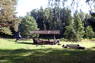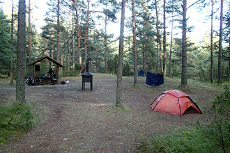 As soon as we got on the road we were in love with Estonia all over again. The riding is so good! We deviated from the cycle route onto a G2 track. Usually these types of tracks could be anything from not rideable to paved. This one was excellent. We stopped to shop at Loksa and then again at Võsu. It is good to have shops on the route! After Võsu we left the road and used a hiking/cycling path to Oandu. This was 9.5 km and took us right through the forest on a tiny track covered by pine needles. It was quite slow going but also enjoyable as the trees closed in all around. The forest floor was covered in berries and moss. About half way along we both became aware of strange flying bugs that were plaguing us. They sort of burrowed into your hair and under your helmet strap. They didn't seem to bite, but still... Soon we arrived at the Oandu Outdoor Centre. This was a collection of all sorts of educational buildings, a heritage walk and a little further on, the RMK campsite. The lady in the office was very helpful and there was an impressive selection of maps and so on. I asked her about the bugs and even had a sample to show her. She said "Oh, they are moose bugs. They burrow into the hair of the moose". Poor moose! She was not able to confirm whether or not they bite. This is the start of a through-hike to Ilka, 370 km away on the south west coast of Estonia. There was also a well here that we used. We went on to the campsite and there were a few places to camp with campfire places and wood, axes, saws, etc. We soon had the fire going and had a great meal of barbequed pork chops. It is always an interesting experience in a new country because you have to learn the names of different meats, milk, and so on. We thought this might have been beef but weren't sure. When we got to the campsite we got the translate app going on the GPS and after a few false starts containing "collar" and "neck", found out it was pork. So we had a delicious pork dinner.