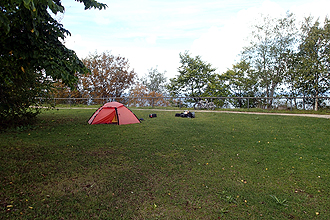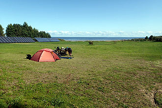 We had no rain overnight but did expect rain today. We put on our wet clothing from yesterday, trying not to grimace too much. We still hopped on the bikes optimistically, perhaps our spirits were bouyed by the fact that Mike had whipped out his scissors and chopped 30 km off the day's ride! Our planned route, which was the cycle route, had hugged the north shore, following the coastline closely. The weather we had yesterday and were expecting today did not support this kind of crazy plan, and so we made some changes in support of staying as dry as possible! We had a late start as our sleeping bags were too snug to vacate.