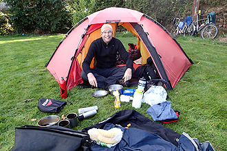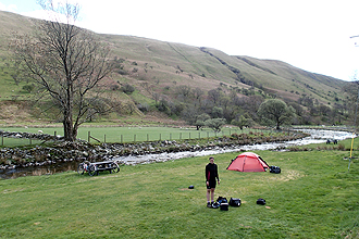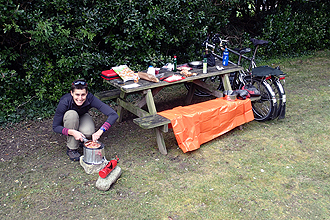 Somehow the distance travelled doesn't do the day justice. We left our campsite at 8am and arrived at the next campstie at 4pm. The effort seemed to amount to far more than 56km! But let me start with the previous night. It was very, very cold in the tent. We wore very warm clothing and still the cold crept in. I unfortunately unzipped my sleeping bag to visit the bathroom, catching Mike's bag in my zip as I did so. This resulted in a tear to his bag so I was reparing that by the light of my head torch at 9pm or something. We woke to the sound of sheep baa-ing as opposed to birdsong. The sun was out but when we opened the tent it was covered in ice, as was the ground and bikes and bench. Also, most of the water in the 1.25L bottles left on our bikes had frozen solid! So it WAS cold!