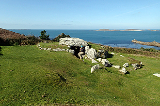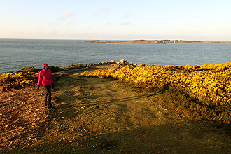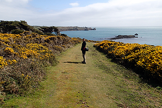 On our first full day we walked around the southern part of the island. It is a beautiful place, the sea always in view. It was overcast on this first day and cold but no rain. There are some interesting sites such as ancient burial chambers (4000 BC) and an old cemetry. Traditionally the island made its money from growing flowers and there is still much of this; fields of daffodils are seas of yellow. Cute stone farmhouses around every corner. Purchase free range eggs on honesty system by the roadside.