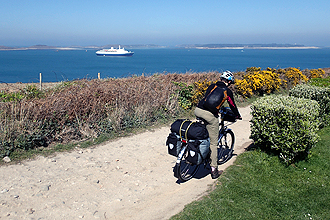 Wednesday was a bit of a lie-in and then getting organised to leave. One advantage to camping for a long time in one place at the start, was that we got into the routine of camping and cooking, etc. without the exertion of riding. So we had time to organise the panniers and pack well. Our hiking boots/cycling shoes had performed really well with all the walking we had done on the islands and now it was time to fit the cleats for riding time. We took the bikes for a "spin" around the tent site and felt that was enough of a practice! We packed and rolled down the STEEP hill to the town and Mike's wrist passed it's first test: Yahoo! We had a couple of hours to spare at the waterfront so bought steak pasty for lunch and wrote and posted a postcard. There was a bit of excitement as a large (well it looked large for St Mary's) Cruise Liner - Marco Polo was anchored in the bay. I asked the Postmaster about it and he said that it was sailing from Dublin to Guernsey stopping here en route. 750 people would be ferried either to St Mary's or Tresco to spend the day.