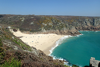 After some steep climbs we left the coast behind for the moment and followed the narrow hedged lanes towards St Buryan where we stopped for brunch. It was only 5km from here to the Minack Theatre in Porthcurno. The theatre was closed as there was a performance that night so we could not go in but it is a fabulous open air theatre cut into the rock with the backdrop being the majestic ocean. The coastline was spectacular and we looked down on Porthcurno Beach which was certainly popular on this sunny day.