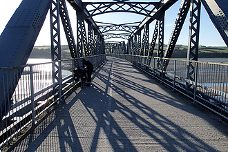 The mist grew very thick during the night but by morning we were suprised to see clear blue skies when we poked our heads out of the tent. We could see the mist down in the valley which is where we were headed. We followed the last part of the Tarka Trail to Barnstaple, stopping to shop at Bideford on the way. The trail is fantastic, flat and well surfaced and we cannot recommend it highly enough as part of a route. The mist was so thick on the trail that we could not see the view at all but as we neared the estuary that Bideford sits on, we could appreciate that it is highly tidal and much of the place was damp mudflats with ghostly rusted old ships lurking in the misty doom. We had brekky en route, just after Bideford, as we had made an 8am start. Mike had said "Buy all the food we need for the day" but was still suprised when I emerged with a quiche and a blueberry cheesecake (which both survived the long day ahead).