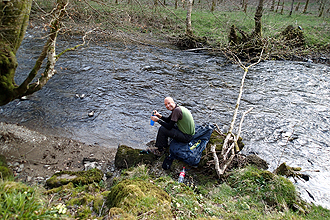 Barnstaple is a large place and shortly thereafter, the day's climbing began. It was certainly a treat to have 30 km on the flat Tarka but when the climbing began it did so with a vengeance. We were to climb 500 m up to the Exmoor National Park and were hoping that the views warranted the climb! It was a bit upsetting to lose a lot of the height we had gained, at one point hurtling down into a valley only to climb up again, so it was all in all quite tiring and demanding. The National Park was moorland and the views from up top impressive. We were fortunate to see a herd of deer at the top. We were to drop down to Dulverston to our campsite and it was a great ride from there all in all. The weather once again faultless. Many super cute lambs to admire. The drop to Dulverston was at 20% gradient but when we arrived at our planned campsite we were advised that no tents were permitted; caravans only (what a snooty bunch!). Very upsetting. The lady at reception directed us to a different site that would take tenters but checking the GPS it was out of our way and there was another site 5km on. Same story however. So we then decided to make our way the extra 15 km to the suggested site (the day would have been over 100 km by then) but on the way passed a lovey riverside field which would be perfect to camp in. So there we stayed. Dip in river was freezing but quiche and cheesecake were delicious. The area was close-ish to the road so we only put the tent up at sun-down. There were signs in the area that deer were present and there were deer foot prints in the mud at the water's edge so we pitched the tent to try to stay out of the way of any lumbering horned creature. Now time to fall asleep to the sounds of the river running by.