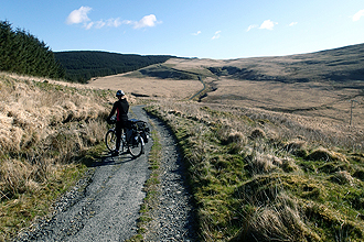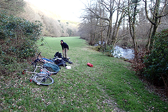 Well, it was bound to happen sooner or later, a day of brilliant riding! We had seen much of pretty Welsh countryside and today she served up SPECTACULAR. We had an early start at 7:15 am and began our cocktail of some cycle way and some major road. We had a great ride this way to Lampeter and then up to Treganon, where we took the cycle route 820. It was the right decision, an absolutely beautiful ride. Good gradients and two biggish climbs followed by a big descent. It was a sunny, but cold day and the air was very clear. The views up into the heath-covered hills were beautiful. We then continued on a roughish track for a couple of kilometers which changed into gravel road at very pleasant gradients. Beautiful river valley. We were aiming for a campsite at around 80 km which we had only found reference to on the GPS. The area had turned to heath-covered hills and the rocky remains of the old mines of Elan. It was an amazing lanscape and unexpected. We suddenly came apon our campsite at Tyllwyd Farm. We couldn't believe how beautiful it was. Will feature in our top 5 campsites of all time! Situated on a bend in the river, grassy sites with benches, and sheep and lambs covering surrounding hills and meadows. Usually you pass such a perfect spot at midday when you've still got 40 km to go, so for it to be our end point was unexpected. Oh, and we were the only patrons!