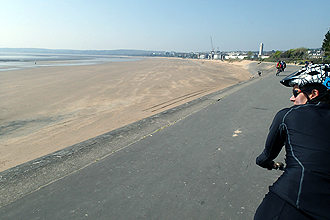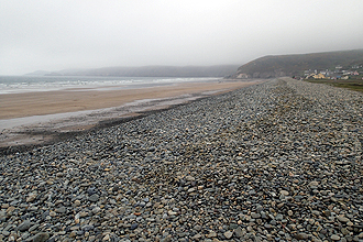 We arrived in Pembroke, with its imposing castle, after 25 km and made our way back along the cycle route around West Haverford which followed a rail line. We spent some time there as I had broken my GPS mount and needed a new one. It still holds the GPS in place but this may not continue. We tried a couple of bike stores and an outdoor shop, but no luck. We decided to camp in the early afternoon as if you can save yourself getting wet this is preferable and the drizzle had started up again. We aimed for a Caravan and Camping Certified Site in Roch but couldn't find it when we got there so continued down to the coast at Newgale. Wow, what a place! Seems very desolate at the bottom of the hill, a long beach seperated from the road by a pebble bank. The campsite was a windswept field of grass with little shelter and one other caravan. The office was unmanned and showers required tokens so we called the manager. She said "Sure, pitch up and someone will be along in an hour or so" to which I responded "Yeah, we're cyclists and would love a shower!". She was so kind, she popped along in a few minutes with tokens in her hand and said that someone would check us in later! It actually only rained when we were putting up the tent and as soon as it was up it stopped! We had some food, a snooze and later braved the winds on the top of the pebble bank to check out the beach.