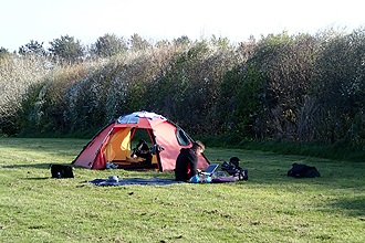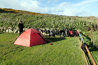 Mike's runny nose turned into a bit of a cough and we decided to spend the day at Sennen Cove rather than risk any further illness. It was a day of heavy cloud and cold wind and Mike rested in the tent. I rode down to St Just 5km's away to buy needed supplies; we had raided the camp reception kitchen the night before and had a tasty meal of tinned soup and veggies, however a famous Warren's Cornish Pasty would surely beat that? I popped along and was back within the hour with a full pannier of meals: bacon and eggs, pasty, fresh rolls, yum! I also hung around the tent and read and we just relaxed really. The campsite overlooked the Land's End Airport so we were kept entertained by the arrival and departure of many tiny skybus planes that ferry holiday makers to Scilly amongst other places. We booked in for another night. The campsite was a pleasure; two couples ran it and it was spick and span. I chatted to one of the couples who had been travelling Europe in a campervan in summer and living in their spanish villa in the winter months. They were now doing so month stints over the summer at various clubs in the organisation and were able to stay and work in fantastic places.