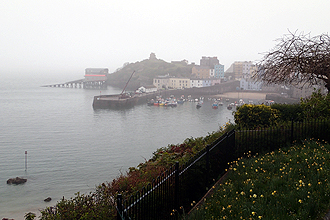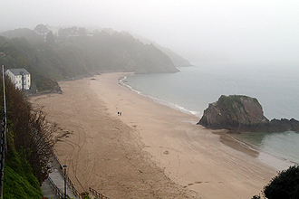 As we had been warned by many well-meaning Welsh folk all week, the weather would turn by the end of the week. True enough, we woke to quite thick cloud and drizzle. The previous night we had chatted with the only other camper there who was so friendly and interested in our trip. She had told us the rain would arrive after lunch. We set off towards the main street, about 1km, and when we got there we stopped to put on long gloves. For the first time we were in full wet weather gear, not bad after a month! As we got back on our bikes Mike said "Puncture!". Of course it was his back wheel, so bike had to be unpacked and tools located for the procedure. At first we thought it was a faulty valve but then it became clear it was a puncture. Eventually we found the source of the problem, a 6mm long nail that had totally embedded itself in the tyre. Anyway, all repaired and we were on our way; 30 minutes later! We stopped to buy brekky and then arrived in the little village on Tenby where we sat down to eat. Tenby is really pretty and campsites abound.