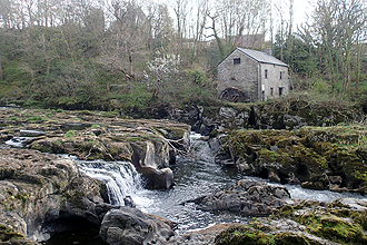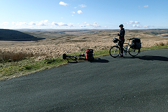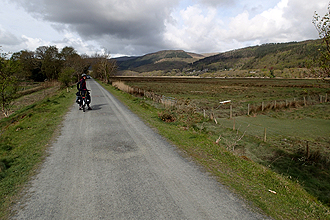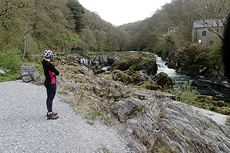 We set off up a small track that wasn't rideable; Very very steep! The first 5km were really very steep and the views of the surrounding valleys superb. We then descended (of course) into Llangurig where we bought brekky at the post office/village store and arranged a delivery of a new GPS bike mount to our campsite in Holyhead. This entailed booking into the campsite as well. It had been very cold on the descent and we were freezing. We decided not to follow the cycle route to Llanidloes but to follow a secondary road instead until we met up with the cycle route. This was a very difficult ride with very steep climbs and steep descents. After the punishment of pushing the bikes earlier, it took it's toll. One climb from a dam wall crept up to 14% and went on forever, which had me walking AGAIN, but Mike rode it. After that, things settled down. It continued cold but blue skies. We had the choice of continuing on the road to Machynlleth or going back to the cycle route and chose the cycle route. It seemed the right choice. It was called a mountain road and took you up to the high country once again but the climb was only 5km long and very beautiful. The bone chilling (literally) descent was 12km and rain set in as we entered Machynlleth. We took refuge in a coffee shop which had a fire burning in the grate and Welsh folk singing as the background music. It was lovely. We came out to blue skies but still cold and the thought that we had about another 30km riding time and it was 3pm!