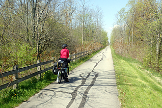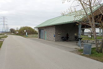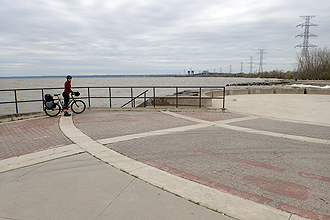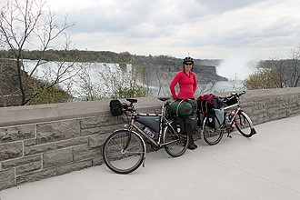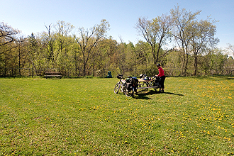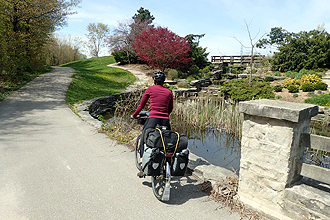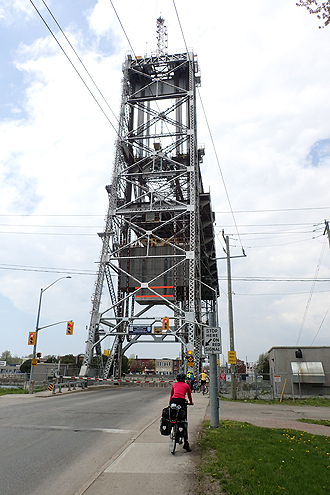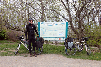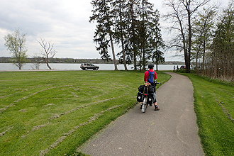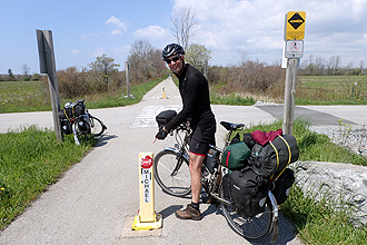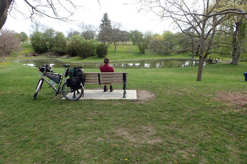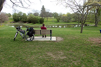 We left the hotel at about 9:00 am on 10 May to return to the airport and collect our bikes which we had stored there. We then set about putting them together, and getting them set up. We then set off from the airport on our Canadian adventure. A wobble or two (the loaded bikes are always so ungainly until you get used to them again) and we were off, under crisp blue skies. We were soon riding through the beautiful Centenial Park and would later pass through Missassuaga on a wonderful cycleway. We were impressed with the day's ride. Canada is different. The roads are wide, the buildings big and yet the place seems very relaxed and unbusy.