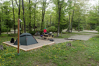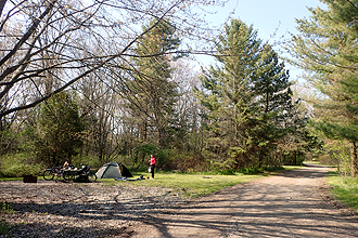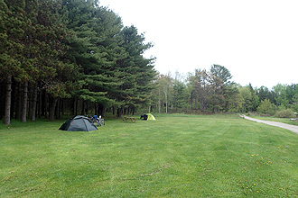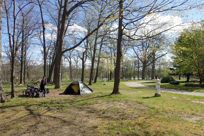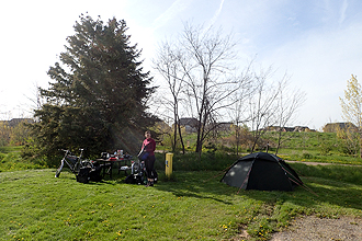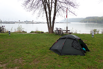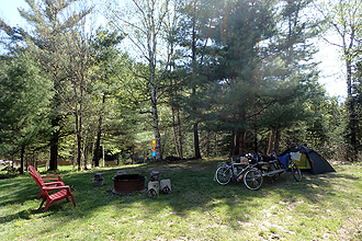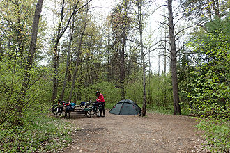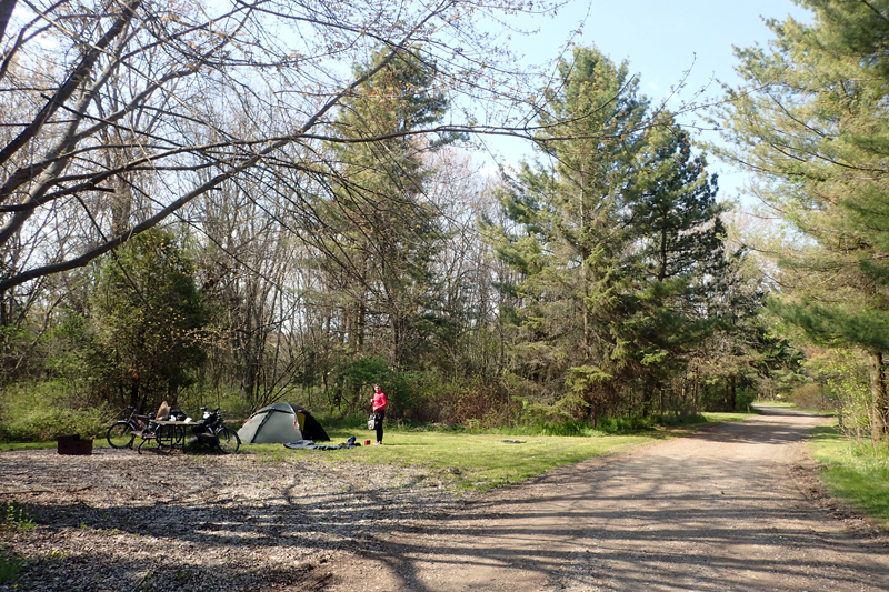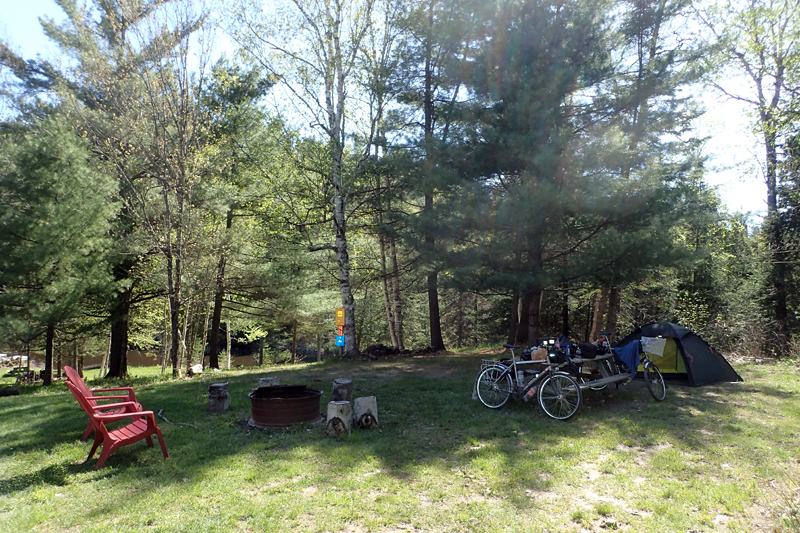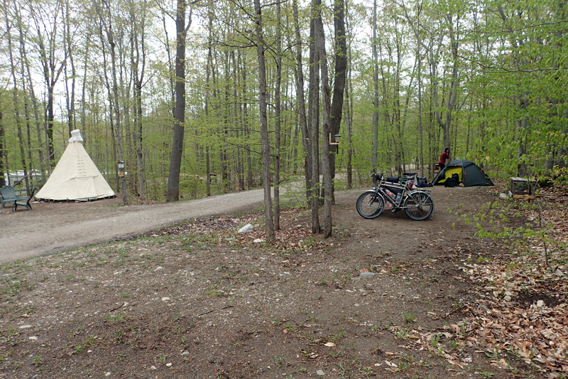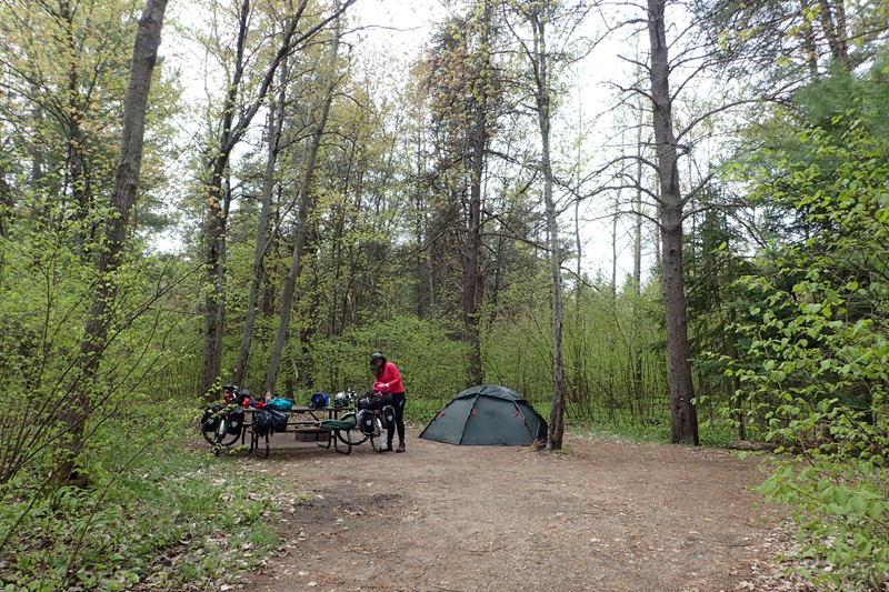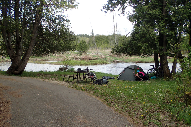 The last 20 km followed a rail trail into the town of Owen Sound and then we followed the loop down to the campsite. The campsite itself was wonderful. We were mindful of the fact that this is a long weekend with a public holiday on Monday. Ontario really gears up for this one and there is a total alcohol ban at all campsites for about a week before. We expected that the campsites would be busy over the weekend. Up to now we had been the only campers at every site bar one! When we arrived we were offered a hiker-biker rate (no other site has had this) and could camp in the overflow field. This means we are seperate from the car based camping which is really great. We are now in the world of the "megavan" - massive demountable's which are dragged about attached to the back of large utes/trucks. These are serious campervans (or fifth-wheelers as they called).