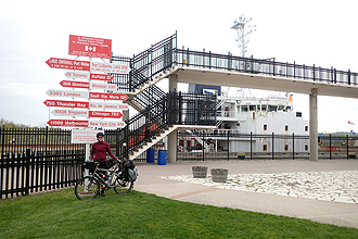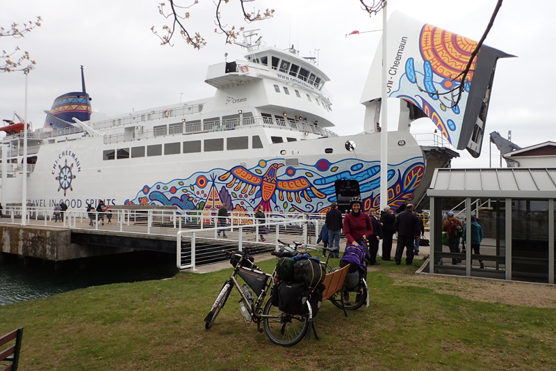 We were in plenty of time for the Chi-Cheemaun Ferry and bought our tickets. We were told to wait in lane 4 at 1:00 pm but the ferry would be running a bit late. We waited in the ferry terminal which was quite nice. The ferry runs twice a day at this time of the year, three times today due to it being a holiday. In the end the ferry was an hour late due to problems with the hatch; it wouldn't open in South Bay (Manitoulin). Anyway, we set off on it at 2:30 pm and arrived at 4:30 pm on the island. We had 14 km to ride to our campsite.