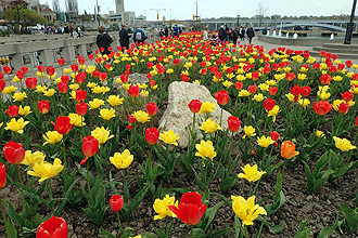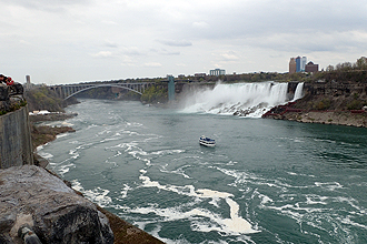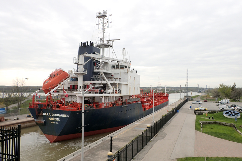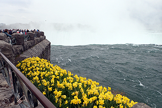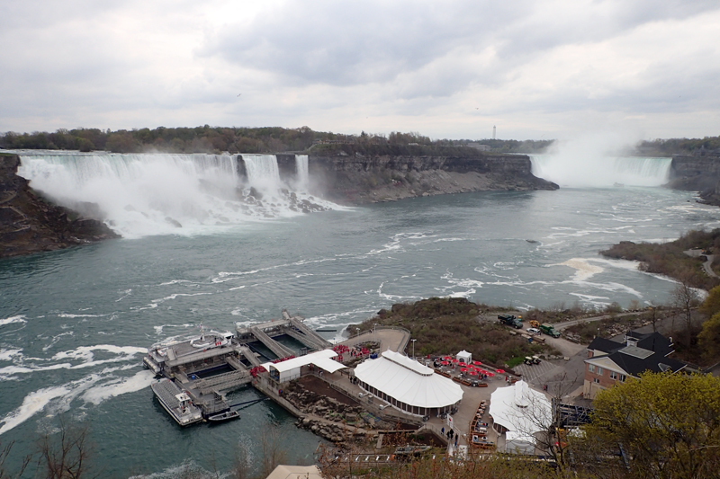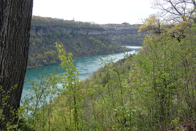 We took the turn off to Lock 3 on the Welland Canal. Most people have heard of Niagara Falls of course but this canal that runs adjacent is very interesting. It connects Lake Ontario to Lake Erie and is a major shipping channel (part of the St Lawrence Seaway). The ships navigate it via a series of locks to drop the ships down (or up) from one lake to another. It was interesting to see a ship engaged in this process while we were there. We were looking at the cycle map showing the Greenbelt Trail when a group of three lady riders gave us some pointers. We ended up taking Queenston Rd as per the Greenbelt Route right through to the Falls. The end of this pretty route drew us up a dedicated path through the forest to Queenston Heights Park. From here we followed the pretty Niagara Parkway through to the falls. It really was beautiful; even the weather warmed up and the sun peeked out! The whole place is well laid out. There is even a horticultural college up there and you can move freely through the grounds to look at, yes you guessed it, TULIPS. You can only be in love with the vitality of these blooms. Everything is well manicured and finished off. We were able to stop a few times to admire the gorge and river and then passed through the "eclectic" collection of buildings which signal the Falls approaching. From far off you could see the billowing cloud of water vapour. It was a great experience. We had wonderful weather and standing on the pavement overlooking the falls the misty spray just falls all over you. It was a good time of year too as the crowds were small. We spent quite a bit of time there admiring it all and then set off for our campsite.