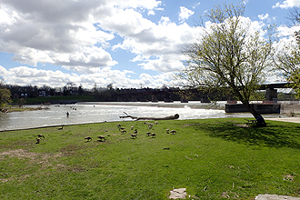 After this it was only about 15 km to our campsite and now we cycled along the Grand River again. We stopped to watch people fishing at a large wier which was called a fishing platform. It was huge and clearly the salmon (we imagine) will be jumping up it and onto someone's dinner plate. The road was flatter now as we drew near to our campsite.
