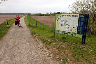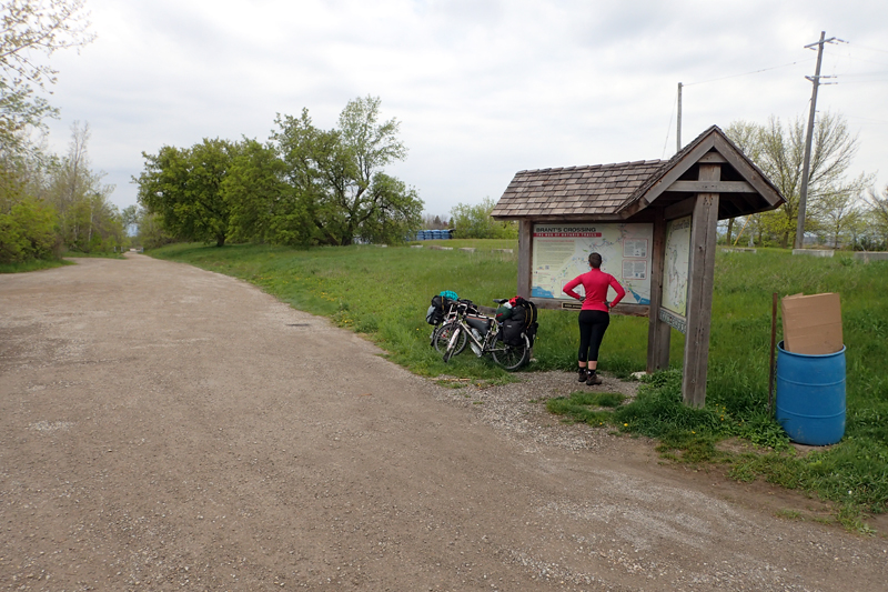 It was a great night last night in the Provincial Park; very quiet and peaceful. No racoons unzipping the tent. We set off around 8:30 am. There are a variety of routes that you can pick to cycle up from Haldimand County to Brant and we picked the Transcanada Trail for most of the way. The route ran close or in sight of the Grand River which is aptly named.