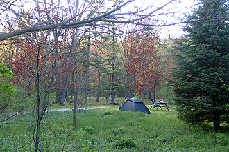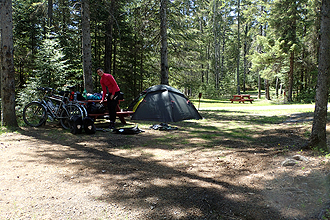 Once again we had a sneaky visitor last night. We are using our bear containers as we should just so we are in the habit of doing so. We leave them quite close to the tent, but when in bear country the rule of thumb is 50 m. But honestly, it seems that they are attracting animals and if they weren't out in the open, you'd probably find that there wouldn't be ant interest in them. Last night Mike thought it was a racoon, but quite a bit bigger; certainly bigger than the containers. Also we have seen a number of dead racoons on the road so they are in the forefront of the mind. When he shone the torch it dashed off but only after it had tipped over both containers and tried to roll them away. Today I remembered a lady I met a few days ago who said that the black bears here are small "in fact most people mistake them for dogs". Anyhow, we will live in blissful ignorance as to the true identity of our visitor.