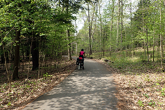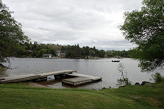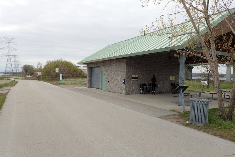 We were hungry by about 1:00 pm and of course all the food stores had been passed and it was now slim pickings. Suddenly we came across a small centre with deli and pizza store. We ordered a jumbo pizza and at first had misgivings about being able to eat it all but it was no contest. Some of the route ran along a secondary road next to a busy expressway called QEB. These bits were not very interesting but they were broken up with moving back to the lake.
