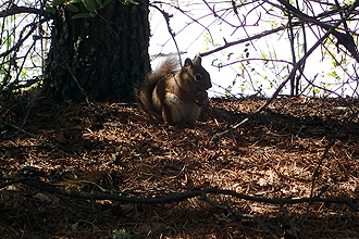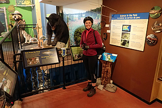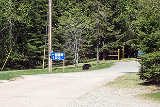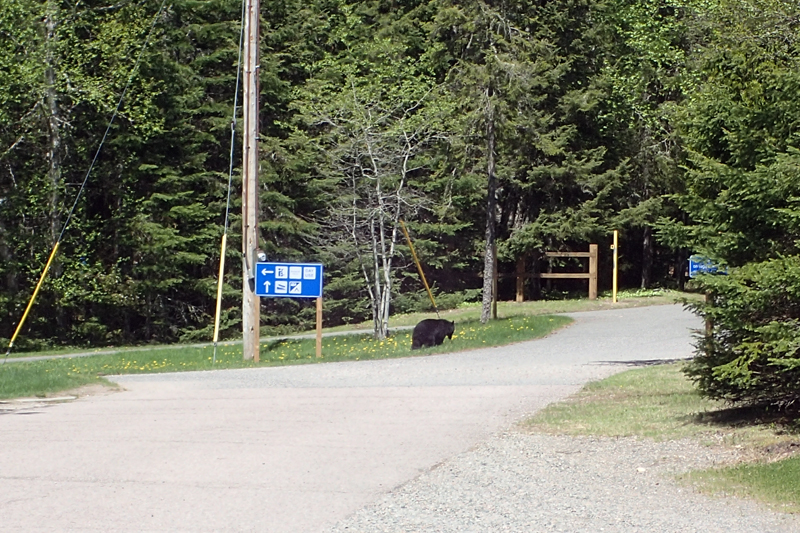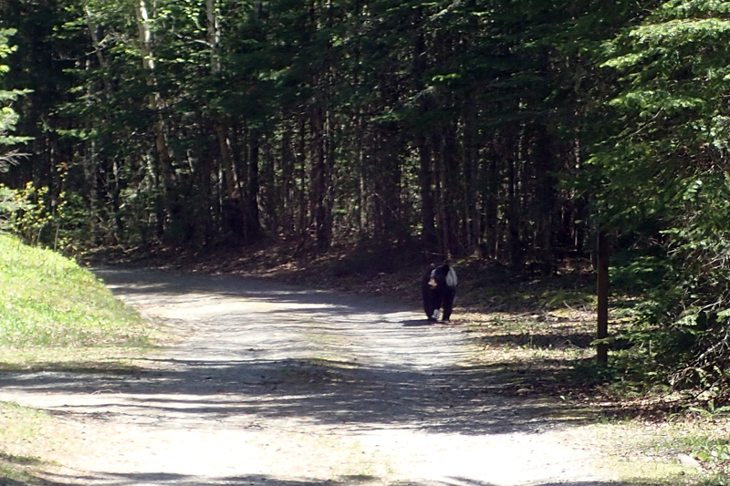 Shortly thereafter, after going into the visitor's centre, we saw two cars pulled over and some people standing by the roadside. "Another moose?" we wondered as we slowed down and stopped. No - A BEAR! Just under the trees about 50 m from us. It looked just the way you would expect a black bear to look, probably too cute and cuddly for our own good. As one of the people took a few steps forward for photo's, the bear started a mock charge and we decided it was time to leave.