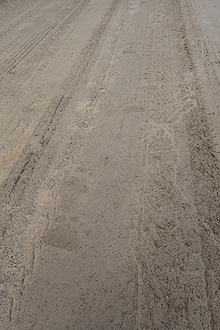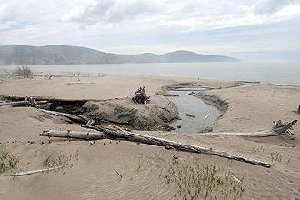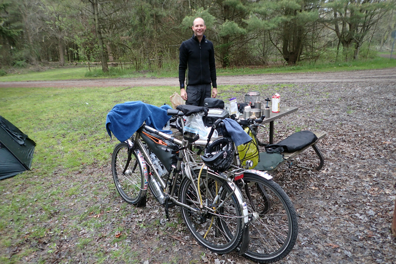 Somewhere in the middle of a very dark night the wind picked up and the tent started to flap a bit. We have no concerns about our tent but it makes you wonder, the wind. What is going to happen next? Well, we found out at 6:00 am when the rain started drumming lightly on the tent. Let me say here that we have been very lucky with the weather up to now. No complaints. By 7:00 am the rain had set in and when you looked outside, sand, lake and sky were full of it. We decided to pack up, carry our panniers to the where the path met the beach (it was too difficult to push our laden bikes along the soft sand, we found out yesterday) and the go to the picnic site over the road to make breakfast under a small shelter. It is convenient to have a bushcamp near a picnic site as they will have toilets and sometimes a shelter and bench. The rain had stopped by the time we had to leave the tent and pack it up. One of the great advantages of our Hilleberg Staika tent is that you can sit inside it and completely roll back the inner skin and then have all the room you like to pack properly, only taking on the rain when you are quite ready to.