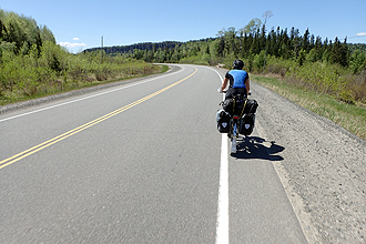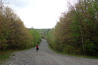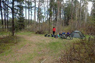 WOW - COLD this morning. The thermometer reading at 7:00 am was -0.2 degrees Celsius. This is as cold as it gets in Perth! But the skies were blue and there was no wind. Also a big advantage of cold weather: no bugs. We set off at 8:15 am for our bushcamp destination. It was a great riding day. The road still had it's usual trucks ploughing up and down but the weather was so good you could only be happy. We were cycling through natural forest and were on the look out for moose. An oncoming motorist slowed to tell us they had just past three moose, which was very nice of them. So we paid close attention for the next few kilometres, but they must have moved on by then as we didn't see them. The road climbed a bit today, but no steep climbs. There were no shops en route, but we did pass a motel which offered groceries, at about 45 km.