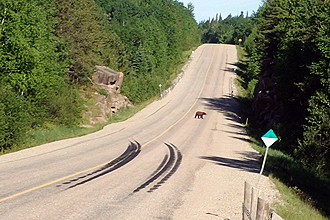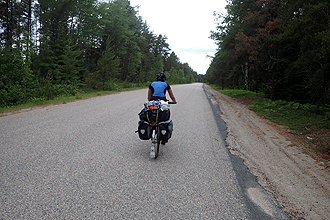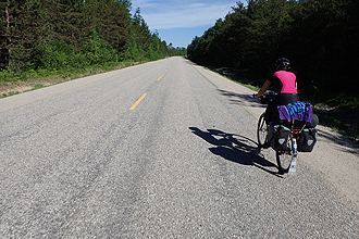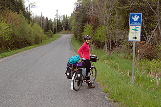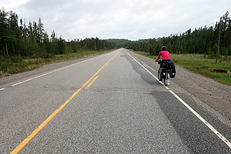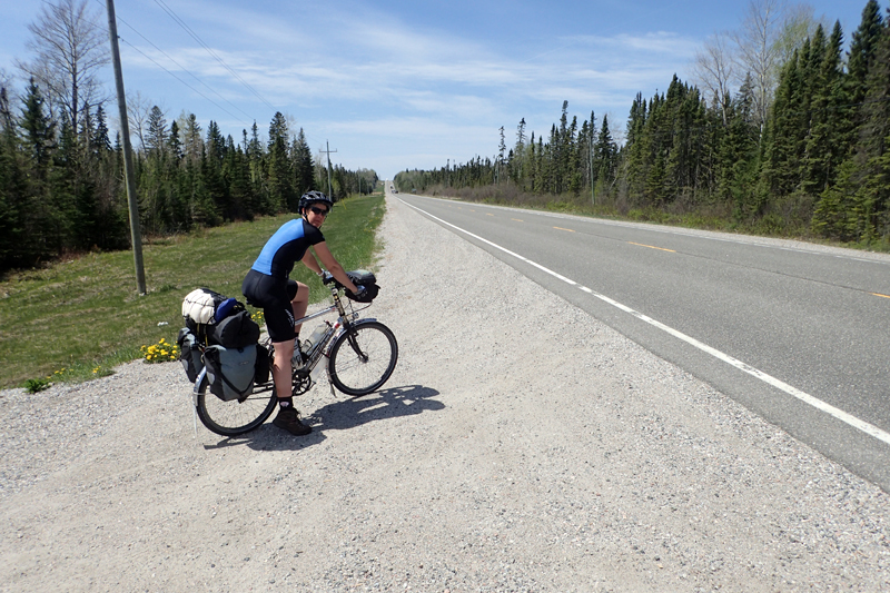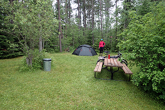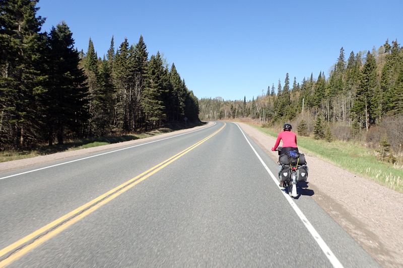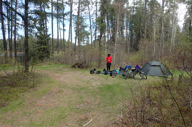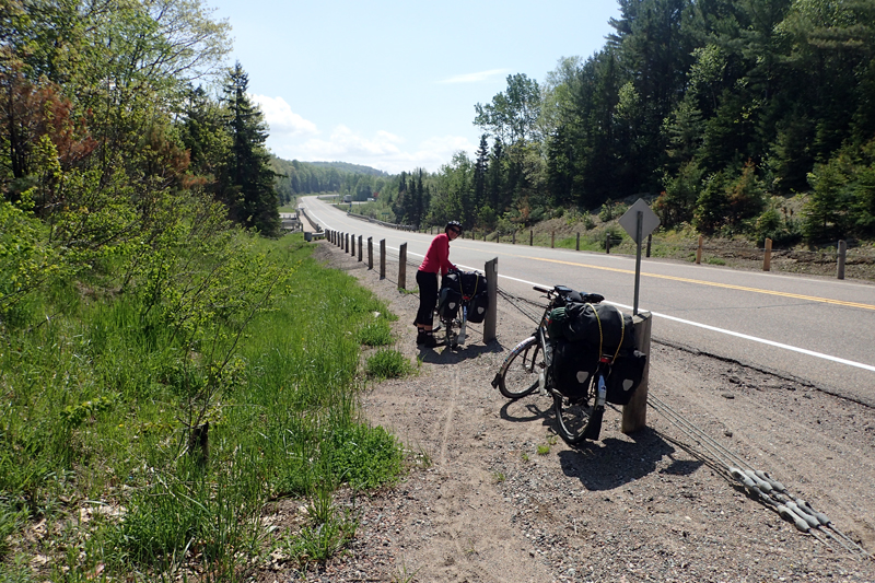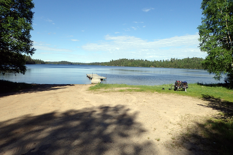 We arrived at our camp spot at about 1:30 pm which was early. The day's ride had been quite pretty with the forest all around as usual, but our legs are were tired from battling the headwind. We would however really recommend this route to cycle tourists. Most tourists stay on Highway 17 from Thunder Bay to Dryden, but when we think back to all the moose that we saw and the bear today, it made this detour really worthwhile. We spent the night on the Trans-Canadian Trail. It is mainly a canoe route in these parts and there looked to be a portage over the road from lake to lake. It is a bush campsite just off the road. Quite a few ticks once again but we are careful. Quite a few of the teeny sandflies too!
