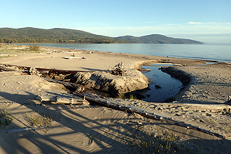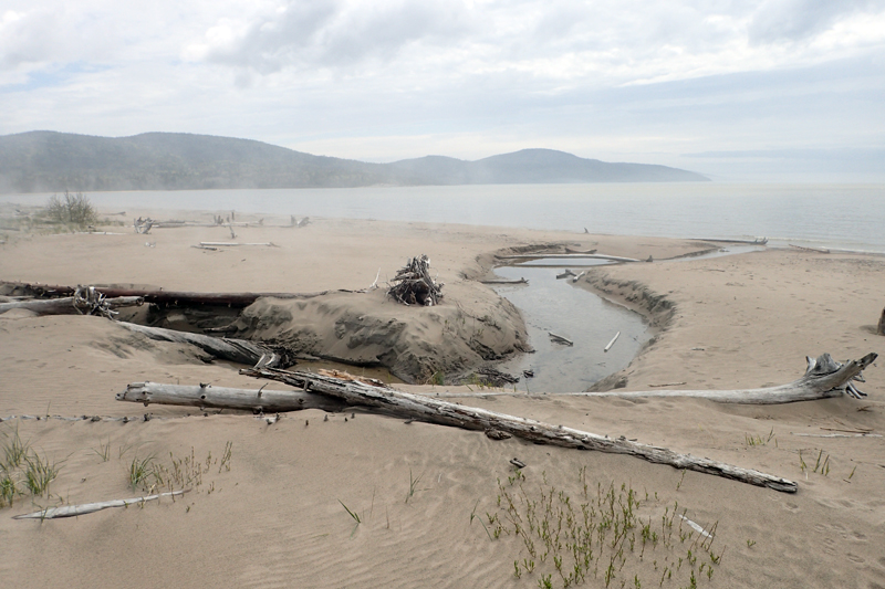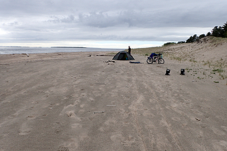 We had planned to camp near a picnic area on the Sand River (this would be a bush camp). For the first time today we had a never ending supply of suitable bushcamps; gone are the "No Trespassing" and "No Camping Signs". When we stopped at the visitor's centre for Lake Superior Provincial Park, we looked at the large map of the immediate park; it is a large park stretching along the lakeshore. They do offer "back country camping" which means that there are designated camping areas and you pay about $20 for a permit and permission to camp at one. Two which looked promising were one at Crazy Creek and another at Coldstream. We were told that the Crazy Creek ones were the best; there were three and they were particularly nice. I asked how we would recognise them as campsites and we were told that there is always a firepit and sometimes benches and so on. Obviously no toilets or showers, this is bushcamping with permission! We were warned that a camper had been mock charged by a bear a week ago at Coldstream and they were unsure if the bear was still in that vacinity. It was a short ride to Crazy Creek and we confidently left the road at a vehicle pull off and walked our bikes down to the river. Nothing struck us as a camping area though and we left the bikes and walked up along the coastal hiking trail. Eventually, not finding any campsite we chose to abandon the plan and have a look at the Sand River picnic area and then go on to Coldstream. The picnic area is at a big waterfall and we were looking at the map when a local came over to us to give us tips about camping in the area. She knew about the bear at Coldstream too. She said that we could walk our bikes to the lake side of the highway and camp on the sandy beach there. It wasn't a designated "backcountry campsite" but the permit does say that if you are unable to reach your chosen site, you may camp anywhere suitable as long as you don't light a fire.