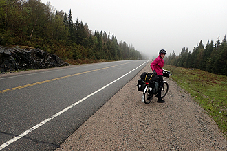 The rain started up again at breakfast, but we were still on the bikes by 8:30 am which suprised us. We set off into a combination of rain and mist, to ride 75 km along the Trans-Canada Highway once again. Visibility was not good, but we have our lights which are well visible from a long way off and again the trucks and campervans were generous. We found out from a fellow camper at Pancake Bay that it is now law to leave 1 m when passing a cyclist, but you get the feeling that particularly the truck drivers have always driven this way. We had a couple fo climbs today, one which was long and gradual and two others. It was still very beautiful being in the provincial park and we kept an eye out for wildlife. After about 40 km we stopped at the park office and picnic area to have our hot chocolate. By this time the rain had pretty much stopped but it was still misty off and on. It was a very cold day; the temperature did not rise above 7 degrees, starting off at 5 degrees and ending up the same. This is cold on a bicycle, particularly when it's raining. We were in full wet weather gear of course and wore our heavy duty rubber gardening gloves for the first time which worked perfectly. To think we had spent $90 on gortex gloves years ago which is what you think you would need, and a cheaper and more effective solution is available and easily replaceable!