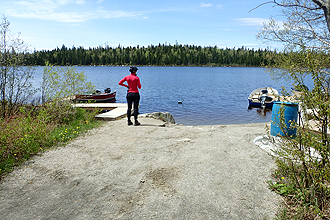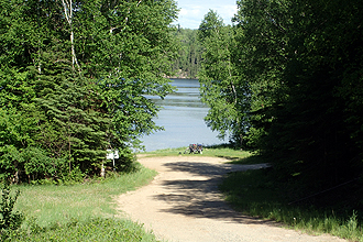 So anyway, we then had to carry the bikes back across the railway line and backtrack all the way to the 623 to pick a different turnoff. All the way we were covered head to toe with the blood suckers and of course talking loudly and dinging our bike bells in case we suprised any bears. As we got to the bitumen, we sat down and checked all over for ticks. I found only one on my sock but Mike had found about 8 in total. None had latched on. A few kilometres down the road we came to another turnoff but it was restricted access at a mill so then we had to make the gut wrenching choice to go all the way back to the Corner Diner and back onto Highway 11 and then ride to Atikonan and onto the 622. Atikonan was about 25 km away but the road was easy riding and we sat down to delicious fruit smoothies and muffins at Robin's when we got there. We also bought 4 more muffins for the road. At $1.50 each who could resist? It was then onto the 622 which was quite hilly but pretty. We passed Finlayson Campground and wanted to get about 25 km further down the road. However, Mike knew about a bushcamp at a lake where there was a jetty so we stopped there to check it out. It was perfect! We chatted to a couple from Atikonan who were just off in their boat to a lakeside cabin. There were quite a few cars with boat trailers parked at the jetty and the guy said that they would be campers from Finlayson's out fishing who would return shortly. We had a wonderful cold swim which is the best thing to soothe all those bites. Camping is allowed here, just not at the jetty. After a good meal, we have strung up our garbage in a tree and are in the tent for an early night.
