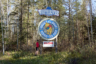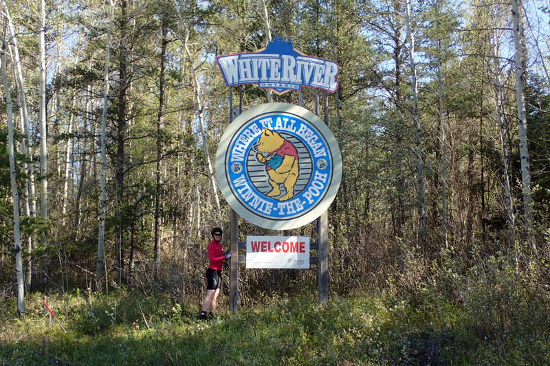 Our first stop was about 15 km down the road; White River. We stopped for supplies at the grocery store. This is the town where the Winnie-the-Pooh story began. It is a tiny town; population 1000. Google White River/Winnie-the-Pooh. The story will suprise you, it is worth the read. All the streetname signs have a picture of Winnie-the-Pooh on them. I bought a shopping bag with Winnie-the-Pooh on it. I hope all the bears we meet are as philosophical. Mike was starting to feel a better and we were enjoying the day.