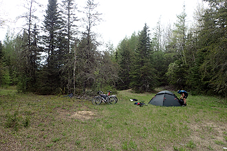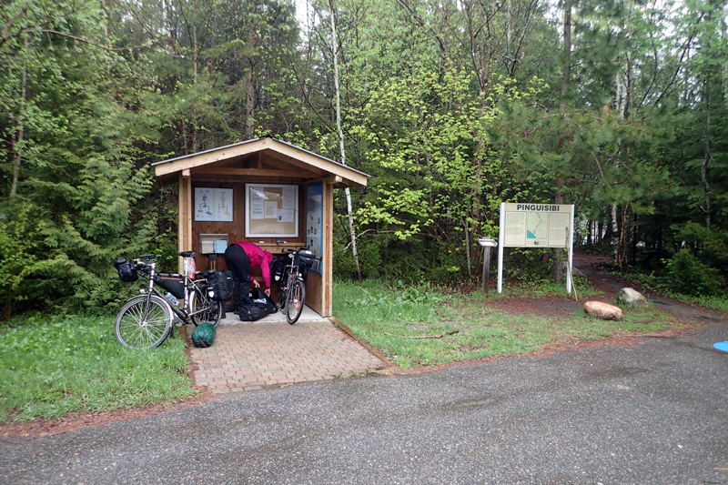 Of course, 3 km before our end point, it started to rain. We had been steadily travelling towards a big storm for about an hour. When the first drops began to fall we took cover under our plastic sheeting that we lay under the tent. After a while the rain eased and the bugs came out so we jumped back on the bikes. We arrived at our campsite at Shebandowan noting that it looked more like a run-down trailer park. We had checked out their facebook page and it seemed they were open for the season. We asked the guy in the office for a tent site and he replied "We don't really do tents. We have two aggressive bears that come here and basically destroy tents". Enough said! We were ready to move on. This would not be the fault of the bears though, it just means that the site does not practice proper bear safe hygenic procedures and who wants to hang around a place like that anyway?