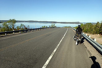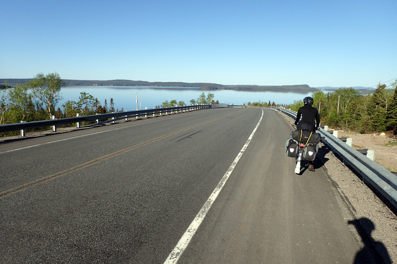 Two memorable things about today; one, the scenery and in particular the views of the Lake were the best we have seen, and two, we were PLAGUED by black flies. Starting with the former, the scenery had been getting progressively better over the last two days and today was spectacular. The Lake was a mirror and reflections abounded. As for the latter, we were super pleased to be on the bike as the flies were swarming at the campsite. We smothered ourselves with bug spray and cream and breathed a sigh of relief once we were on the open road. No sign of bear either. However, we soon noticed that there were also bugs around us as we rode, and on our first uphill stretch they were unbearable, a large cloud of the hovering around our heads and torso's. Anyway, nothing a downhill can't cure.