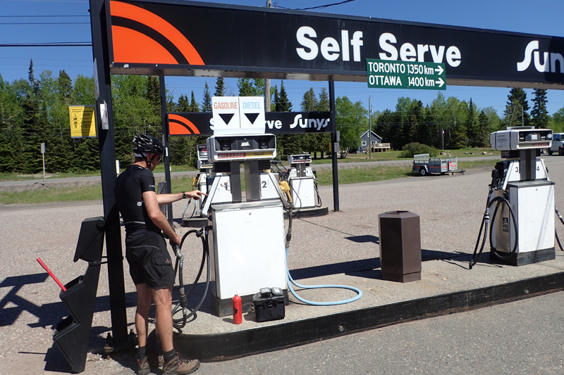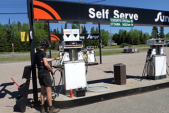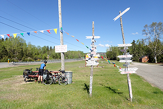 We stopped at a First Nation's store to buy something for tea/lunch on the road and then had a construction stop-go. The bugs were just unbelievable. Even a couple of construction workers commented on how bad they were. The day soon warmed up and we had the bugs, the heat, some hills and the beauty of Lake Superior. It was bitter sweet. We stopped at Gravel for our tea/lunch break and I went into the coffee shop to buy a drink and when I came out the bugs had found Mike again. Gravel had cool distance markers; from "Lake Superior 1000 baby steps" to " Australia - start digging" and an arrow pointing downwards. Also a sign saying "Gravel - best coffee shop in town". And the only one...
