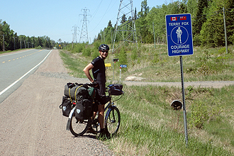 Overall the day was coolish until the end, mostly flat and fast along the highway. The road was busy and the shoulder often narrow. We stopped at about half-way for a snack. I kept my long-sleeved wool top and leggings on today as my arms got quite badly sunburnt yesterday. It had been too hard to layer on bug cream and sun cream. Along our route today we passed numerous road signs saying "Terry Fox Courage Highway". We didn't know the stroy of Terry Fox until we met a camper at Lake Superior Provincial Park who told us that he was stopping at the Terry Fox Memorial at Thunder Bay on their way to Calgary. Look up his name online describes an inspirational story. Kinda makes you stop wingeing about the hills/bugs/weather. Terry had to stop his run just short of Thunder Bay.