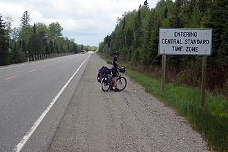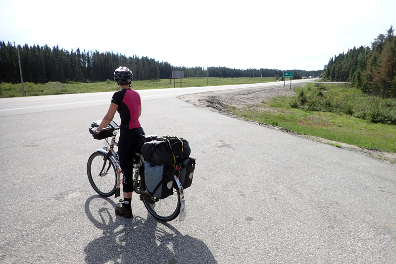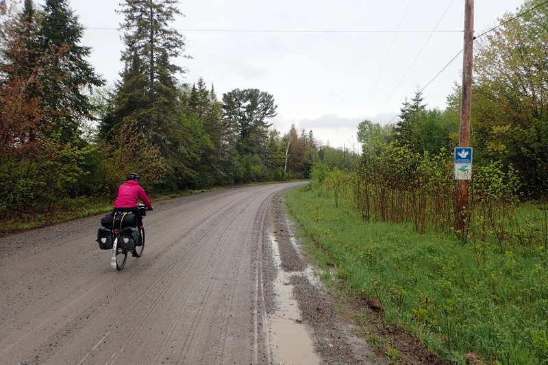 We had rain in the early morning and it let up a little as we got going, but then set in and we rode in the rain all day. Two exciting things happened though: we met another cycle tourist going in our direction, also across Canada, and we hit the Trans Canadian highway!