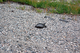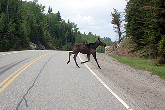 The road was pretty remote today, beautiful vistas of forest, lake and sky once again. We seemed to be travelling towards a very dark thunderstorm for much of it but luckily it shifted off and we escaped a drenching. We had three moose sightings, one lone moose who stared at us over it's shoulder and seemed undecided before vanishing into the forest, one cow and calf which was very cute and another lone moose. This was great for us. Also, a terrapin (turtle?)crossed the road in front of us.