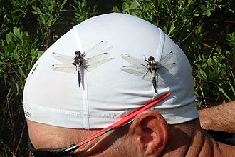Soon after the moose we came across a fabulous area for bushcamping. The lake lay below the road and we could spot a flat embankment running along the edge. It was quite easy to get the bikes down there and we are well set up. The outdoor shower was great and there are NO bugs at all. We think this is due to the dragon fly population explosion which has obviously occurred. They are so numerous that they are even sitting on us! We will have a peaceful night without a security van doing laps!