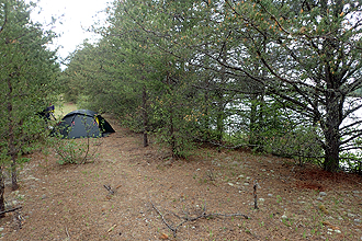 We ended up pitching the tent on a big flat rock which was a better choice than in the grassy clearing, judging by the number of ticks that got onto anything left for long on the ground. We are being very careful about ticks as we understand the dangers. Yesterday I was sitting on a large groundsheet and took off one boot, my foot did not even touch the grass, but by the time I put it on again, there was a tick burrowing into my sock. This reminded Mike to check his legs, and there was a tick that had latched onto his leg. I got our trusty tick remover and he had it off very quickly. We found what looked like moose hair on the ground and surmise that this clearing might be frequented by moose which would explain why there are so many ticks about. Anyway, we chose the rock for our site and had a great night's sleep. I am amazed at how one can sleep without worrying about bears, etc. Our garbage bags (now two of them) were again secure in a tree away from the tent and the bear containers are much emptier now!