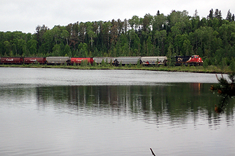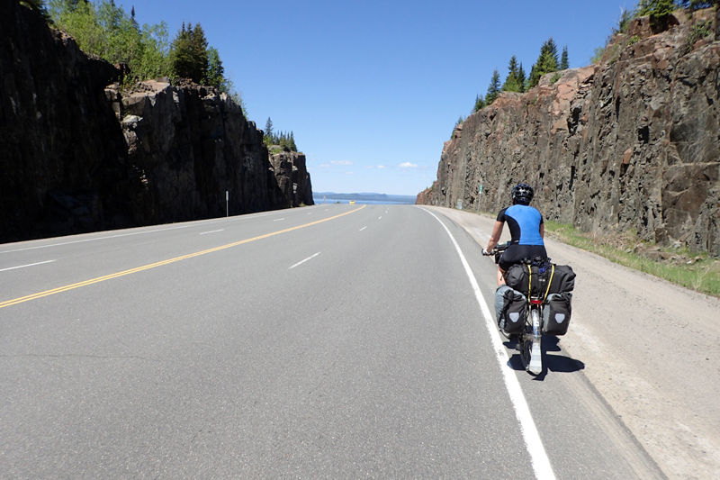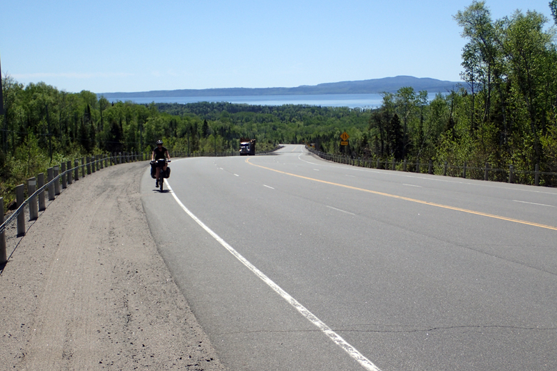 A northerly was forecast for today which would sort of help us if it wasn't a crosswind. It rose to quite strong during the night, but we woke to clear blue skies and it wasn't even freezing cold on the shores of Lake Superior. We had an early start and the first thing was to climb back up to the highway; the 4 km that we dropped down last night. Back up on the highway the wind did not seem that bad. Crazy Lake that creates it's weather. An interesting thing about the campsite was that it was so close to the railway line and you have to ride over the rails to enter and leave. During the night and this morning we had heard a few trains toot as they passed; TransCanada train! We would really recommend this park as the forest and moods of the Lake are beautiful.