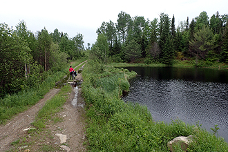 At Quetico North we were able to pick up some tinned food for the next two nights as we would be bushcamping and would not pass another store. We also got some other foodstuffs. No powdered milk though, a little disappointing. They were more about souveniers than groceries. We then set off for the brekky stop which we expected 10 km down the same road. Well, by the 15 km mark and still no diner we started feeling nervous. It would have been impossible to miss, there were hardly any buildings on the road. Suddenly right at our turn off after 19 km, there it was. Great views of the lake, nice looking motel and very neat diner. A welcoming lady cook gave us coffee and even made Mike a "Mikey Burger" (yes, it was called that on the menu) even though it was only 10:00 am. I had a delicious omelette. Coffee was good. We wish we could eat like this everyday! Off we went at about 11:00 am to take the 623 route north. We turned off it after a few kilometres onto a small dirt road which would allow us to join the 622 later on, bypassing Atikonan. The road conditions soon deteriorated as it dived into the forest and became a forest track, muddy in parts with the trees closing right in. Further on we came to the railway line which we lifted our bikes over and continued on the other side until bam! we ran into a swamp. Of course you can imagine while all this was going on we were covered from head to toe in mosquitoes sucking blood from wherever they could. Something told me to wear leggings this morning even though it was warm. Anyway, they don't help against mozzies really, but they do against ticks. Mike had to stop a few times to pluck the dreaded deer tick from his socks. Luckily they are big and easy to spot.