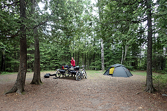Imagine our excitement when, just before the turn off to Neys Provincial Park, we passed the same billboard saying that meals, camping, hunting, etc. were all available just 1 km away! Within that 1 km we had quickly decided what we were going to order to eat, after which we would have a speedy 3 kilometre downhill run to our camp spot, easily done on a full stomach. We happily turned into the parking area for Neys LUNCH and Campground and went into the little office as instructed. They had the usual collection of tinned goodies, bug repellant and potato chips. No lunch room/restaurant was in evidence. We went back outside and looked around the corner. Nope, nothing. We went back into the shop and asked where meals could be purchased. The manager lady replied "No, we closed that a year ago". I almost replied "Time to change your sign then". Hungry cycle tourists are not to be trifled with! We unenthusiastically picked up an extra tin of peas and carrots, a bag or marshmallows and some sweets. When I saw the photo gallery behind the cashiers desk of hunters posed with the bear prey, I decided to keep my opinions to myself.