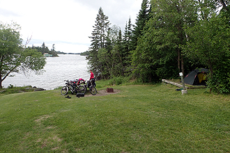 The day felt like quite a slog, probably a combination of rain (it did not last all day), slight headwind and general tiredness. Also, we did not have a decent rest stop due to the rain. Highway 17 turned south into Kenora and we followed it into Tim Hortons for smoothies and muffins. We then picked up some other supplies at Walmart which was on the same road as the campsite. We had planned to go hunt down a good meal but it just seemed too much effort and we wanted to get to the campsite. We picked a lakeviw site and these are well laid out with raised gravel pads and nicely grassed on Lake of the Woods. There is quite a bit of boat traffic. There are no other campers in this section as cars need to be parked up the hill away from the camping area. A nice spot!