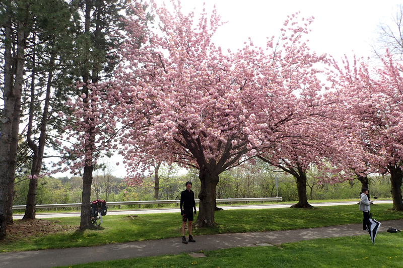We arrived in farmland after only about 20 km and then followed a series of cycle trails collectively called Burnhamthorpe. The road crossed high over rushing rivers. The gardens are all blooming with tulips in myriad colours.