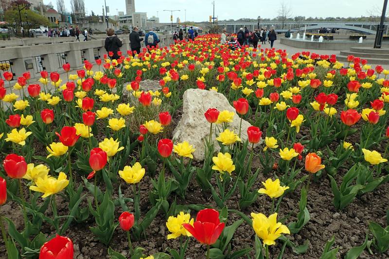 We took a walk to the harbour/ferry terminal on Lake Ontario. We noticed the water level seemed very high which we put down to the recent heavy rains. Spring has arrived although everyone is still rugged up, clusters of tulips are blooming in tubs and garden beds, and the trees on the sidewalks are sprouting blossoms. We collected our online order from MEC, an outdoor store. Two bear containers, bear spray, bear horn and 2 new compression sacks. We were exhausted again and returned to our hotel to sleep, getting up for the complimentary fish and chip dinner at 5:30 pm. We then sorted out some packing; got to find a home for the bear containers!