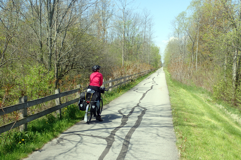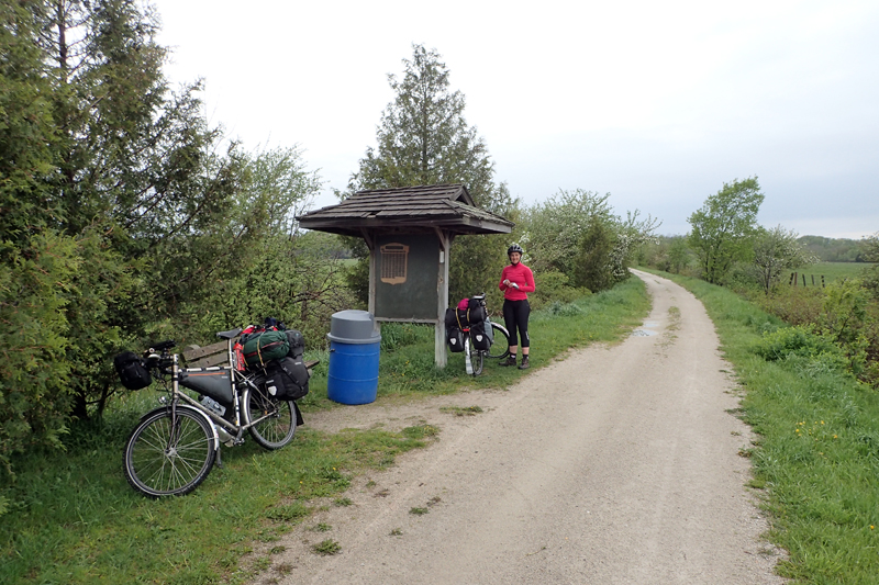 The route was mainly farmland and gently undulating. However a headwind changes gentle undulations to a bit of a challenge. We had a bit of a break at Cayaga where we bought lunch. Having chosen our internet provider for the trip and loaded up ample credit in Toronto, we have had 5 frustrating days with trying to access it. This brought us to the point of sitting outside the closed public library in Cayaga from where we could access their free internet to finally upload about 6 days of the website and pics. More about this later.